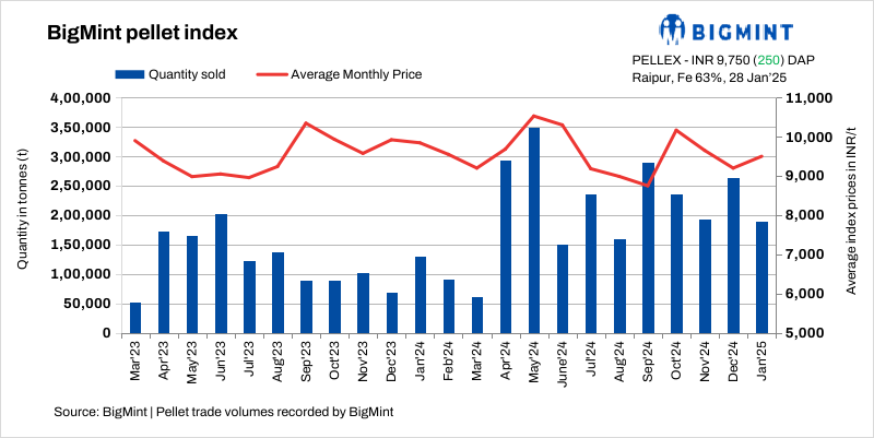 BigMint’s bi-weekly domestic pellet (Fe63%) index increased by INR 250/t ($3/t) to INR 9,750/tonne (t) ($113/t) DAP Raipur on 28 January 2025 compared to the previous assessment on 24 January. No deals were concluded by local steelmakers in this publishing window.