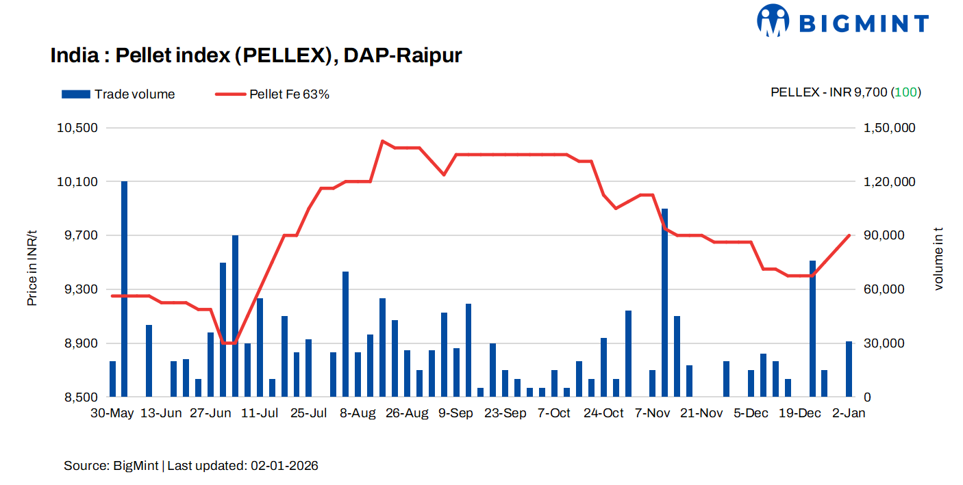 PELLEX, BigMint’s bi-weekly domestic pellet (Fe63%) index for Raipur, rose by INR 100/t ($1/t) to INR 9,700/t ($108/t) DAP on Friday compared to the previous assessment on 30 December 2025. Deals for around 31,000 t were concluded by Raipur-based sellers at INR 9,500-9,600/t ($105-106/t) exw.