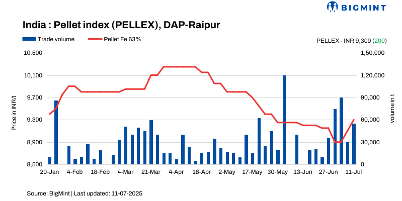 PELLEX, BigMint’s bi-weekly domestic pellet (Fe63%) index for Raipur, rose by INR 200/t ($2.5/t) to INR 9,300/t ($108/t) DAP on 11 July compared to the previous assessment on 8 July.
