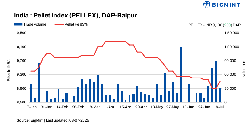 PELLEX, BigMint’s bi-weekly domestic pellet (Fe63%) index for Raipur, rose by INR 200/t ($2.5/t) to INR 9,100/t ($106/t) DAP Raipur on 8 July compared to the previous assessment on 4 July.