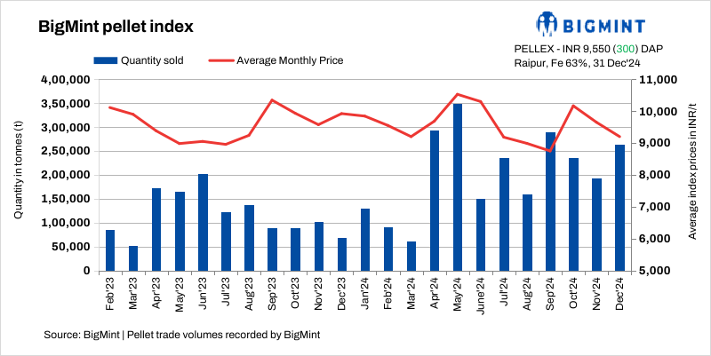 BigMint’s bi-weekly domestic pellet (Fe63%) index rose by INR 300/t ($4/t) to INR 9,550/t ($112/t) DAP Raipur on 31 December compared to the previous assessment on 27 December. Pellet producers sold around 50,000 t at revised offers of INR 9,550-9,650/t ($112-113/t) DAP Raipur. Another deals of 10,000 t was concluded at INR 9,250/t ($108/t) DAP a couple of days back.