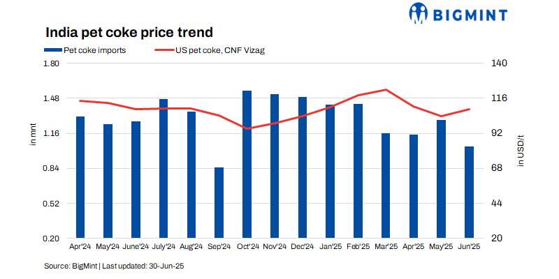 Imported pet coke prices in India remained unchanged w-o-w, with US-origin offers at $107-109/t CFR and Saudi-origin at $108-110/t CFR for both eastern and western ports. Demand outlook stays weak as the monsoon slows infrastructure activity, which is expected to reduce cement production and, in turn, the requirement for pet coke by the cement industry.