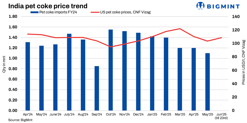 Imported pet coke prices in India remained stable this week. US-origin offers held firm at $107-109/t CFR for both eastern and western ports, while Saudi-origin offers dropped by $1/t to $108-110/t CFR. Freight from the US Gulf Coast to west coast India stood at $35-36/t for Panamax. Demand remains tepid and is expected to decline further as monsoon advances in major markets.