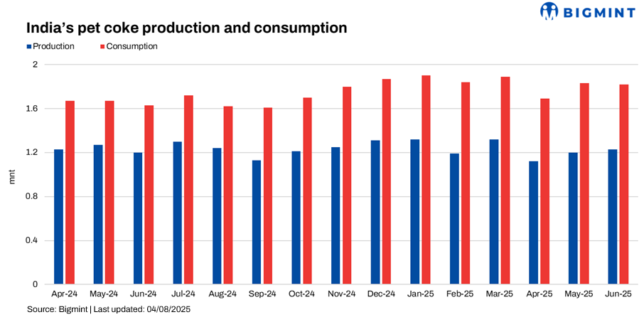 India’s domestic production of petroleum coke in June 2025 stood at 1.23 mnt, showing a marginal growth of 2.3% compared with 1.20 mnt in June 2024. Meanwhile, consumption surged 19% y-o-y.
