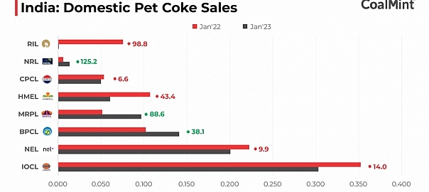 Total domestic sales of petroleum coke for January 2023 dropped m-o-m by 10.7% to 0.87 million tonnes (mnt). On a y-o-y basis, for the April-January period, sales witnessed a growth of 10.8% over the same period last year.