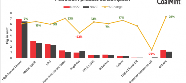 On a cumulative basis, petroleum products consumption in April-November 2022 increased by 15.5 mnt to 145.32 mnt as against 129.82 mnt in the same period last year, registering a 12% growth y-o-y.
