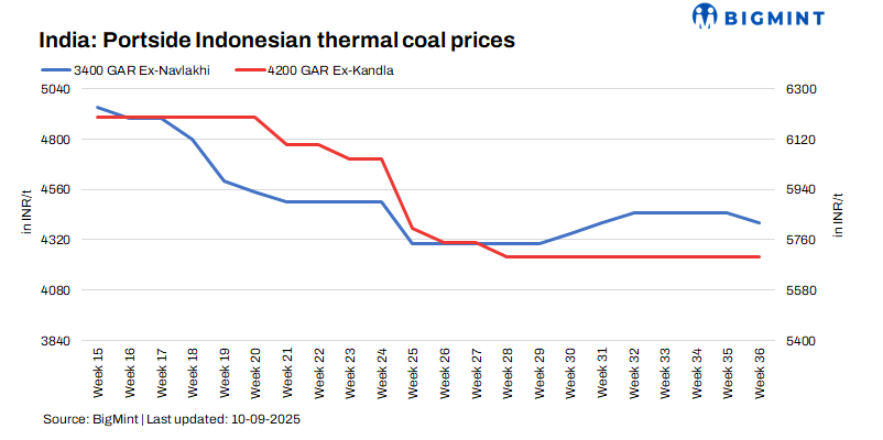 Portside Indonesian thermal coal prices in India declined by INR 100-200/t w-o-w across lower to higher grades, primarily in anticipation of the upcoming 18% GST applicable from 22 Sep’25, sources said. Prices of 3400 GAR material were heard in the range of INR 4,200-4,300/t. Sellers actively sought to liquidate inventories to mitigate potential cess-related losses, leading to downward price adjustments across the market.