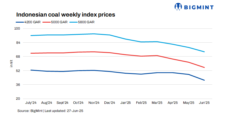 Indonesian thermal coal prices continued to remain under pressure across key Indian ports during the week ending 27 June 2025. The market remained under pressure due to weak demand from core industrial sectors such as steel and textiles, which restricted aggressive buying. Most procurement activity was limited to need-based or speculative purchases. While overall sentiment remained subdued, portside prices largely held firm, reflecting a balance between supply and demand conditions.