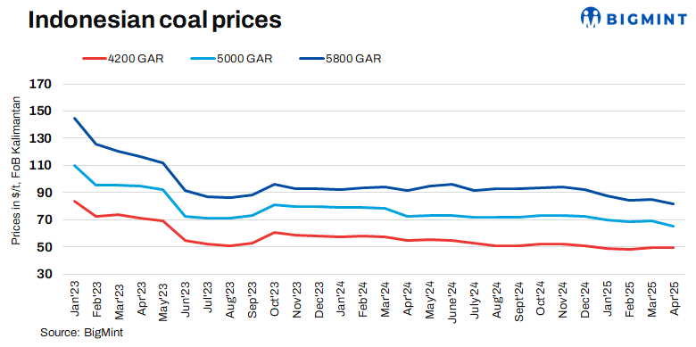 As of 25 April 2025, Indonesian thermal coal prices remained unchanged across major Indian ports, indicating a balanced supply-demand scenario. The 5000 GAR grade continued to be quoted at INR 7,800/tonne at Kandla, while the 4200 GAR grade stood at INR 6,200/tonne in Kandla and INR 6,100/tonne in Vizag. The 3400 GAR grade held steady at INR 4,900/tonne at Navlakhi. This consistent pricing trend reflects a market with limited buying or selling pressure, driven largely by cautious sentiment.
