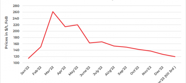 Over the past month, RB1 (6000 NAR) grade coal prices have come down by $63/t and are currently assessed at $190/t. The drop has come amid sluggish demand from Europe and other markets.