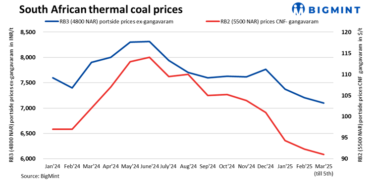Portside prices of South African thermal coal remained unchanged w-o-w at Gangavaram Port in eastern India, with RB2 (5500 NAR) at INR 8,500/t exw and RB3 (4800 NAR) at INR 7,100/t exw. Some deals were heard concluded this week at eastern ports. However, in southern India, prices of RB3 (4800 NAR) increased by around INR 300-400/t amid lack of availability.