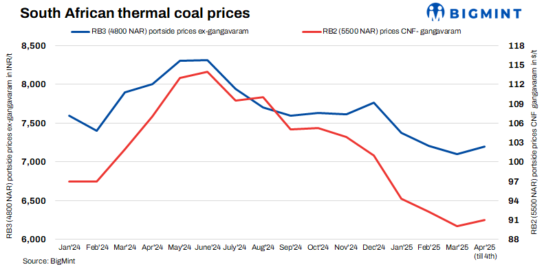 Freights from the Richards Bay Coal Terminal (RBCT) to Paradip stood at $14.2/t, up by $0.6/t w-o-w. Vessel freight rates have risen on improved inquiries and increased fixtures. Notably, South Africa’s non-coking coal exports surged 52% m-o-m to 6.83 million tonnes (mnt) in March, rebounding from 4.50 mnt in February, as per BigMint data. The sharp recovery follows earlier disruptions in February, when railway issues impacted shipments. The overall volume for Q1 2025 stood at 17.27 mnt.