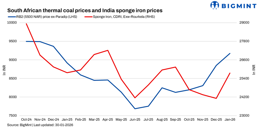 Domestic non-coking coal offers remained stable w-o-w, supported by steady supply from SECL auctions. On 27 January, SECL offered 1,716,050 t and allocated 915,200 t, with bulk mid-CV grades fetching near-floor prices. Sponge iron CDRI, exw-Rourkela, increased by INR 50/t w-o-w to INR 26,300/t, while d-o-d gains of INR 100-400/t were recorded across regions on 29 January. Finished steel demand remained measured, keeping overall buying selective despite firmer raw material sentiment.