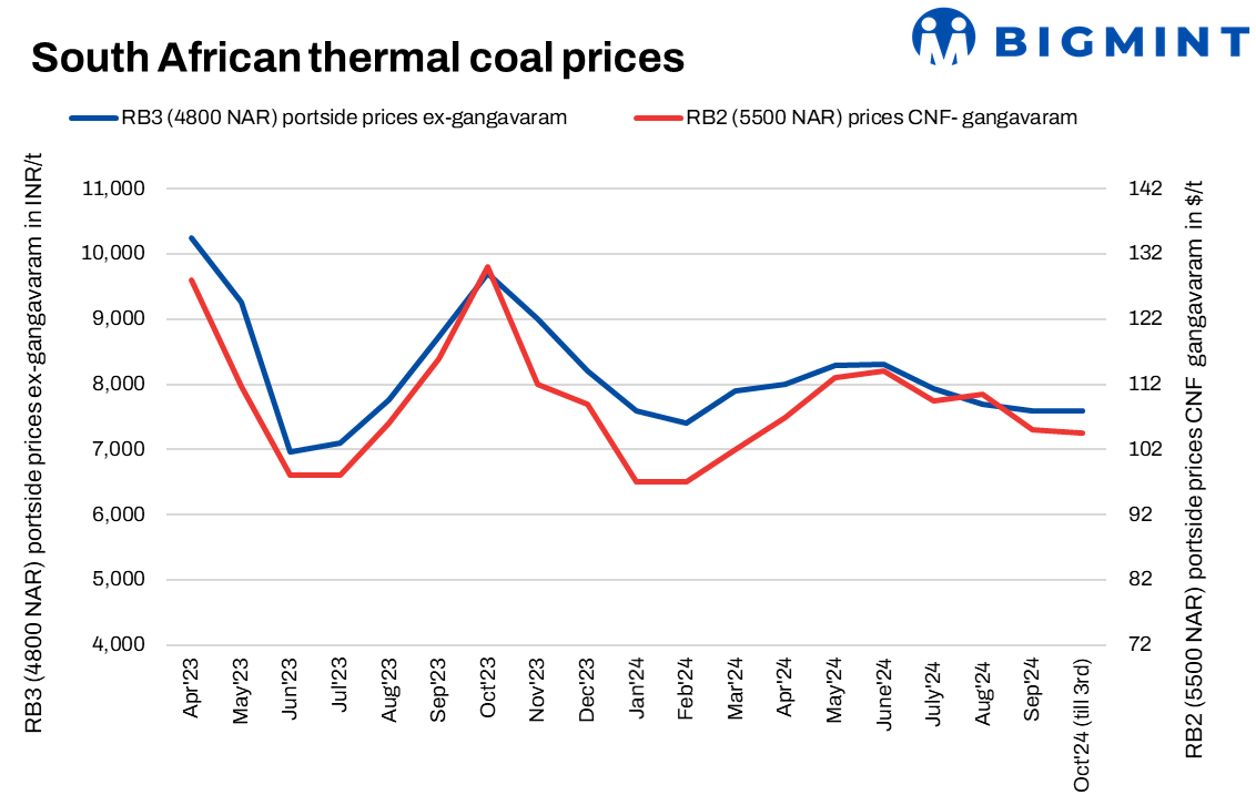 - BigMint’s assessment indicated that portside prices of South African thermal coal inched up this week. RB2 (5500 GAR) and RB3 (4800 GAR) prices were assessed at INR 9,400/t and INR 7,600/t ex-Gangavaram, respectively.