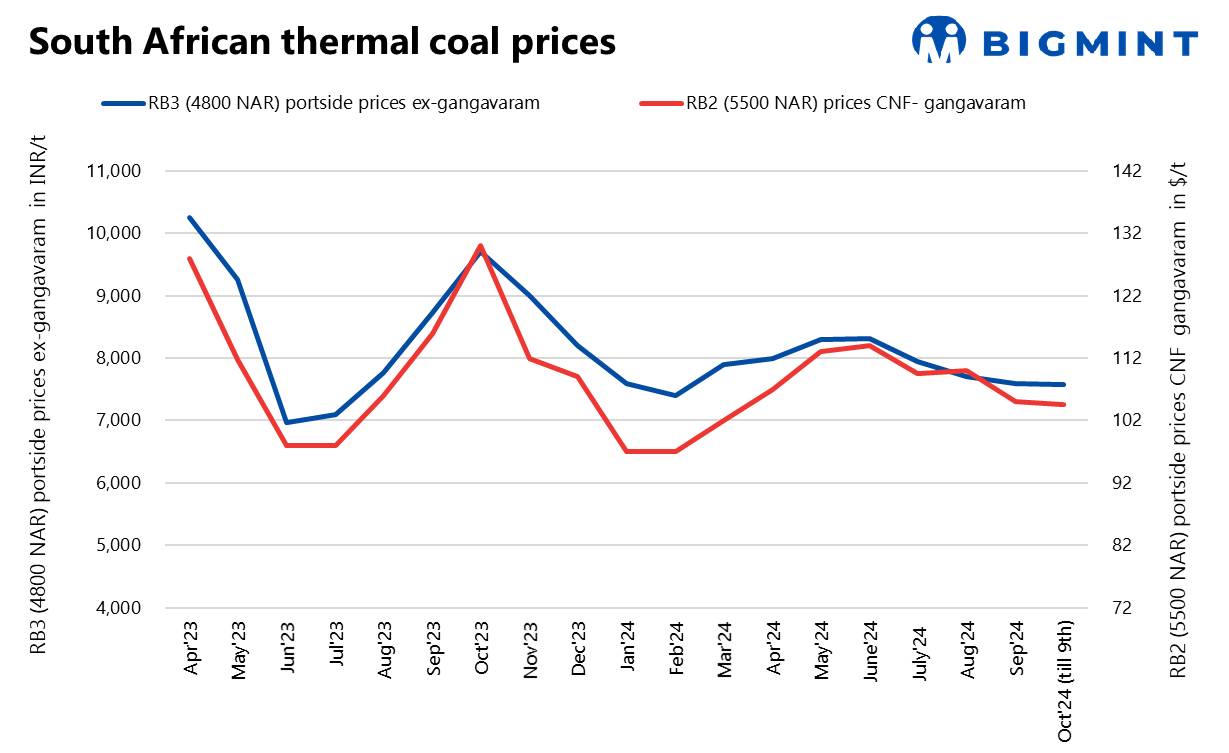 BigMint’s assessment indicated that portside prices of South African thermal coal inched up this week. RB2 (5500 GAR) and RB3 (4800 GAR) prices were assessed at INR 9,500/t and INR 7,650/t ex-Gangavaram, respectively. Prices have picked up in line with an improvement in the international market and a rise in import offers.