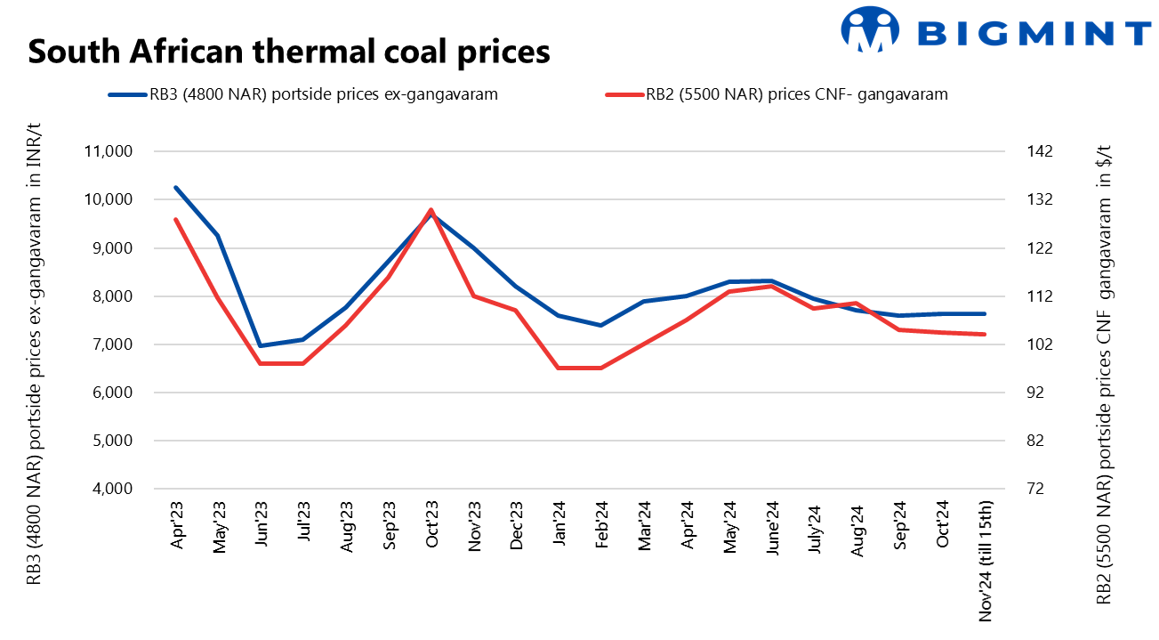 BigMint’s latest assessment shows that portside prices of South African thermal coal edged up w-o-w. RB2 (5500 NAR) assessed at INR 9,550 per tonne (t), up INR 50/t while RB3 was at INR 7,700/t, ex-Gangavaram, up INR 100/t. Prices remained unchanged despite the rise in sponge prices.