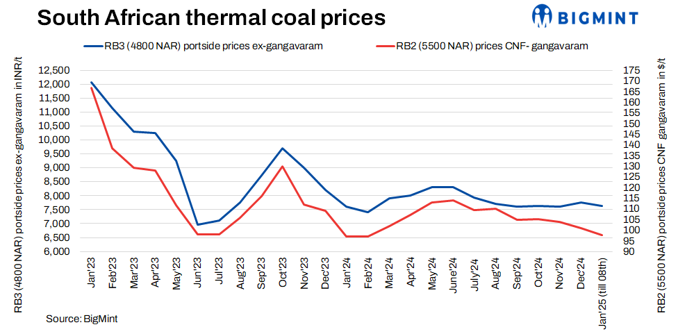 India’s portside prices of South African thermal coal registered a decline of INR 50-100/t this week. RB2 (5500 NAR) dropped to INR 9,150/t, while RB3 (4800 NAR) decreased to INR 7,600/t, both ex-Gangavaram. Weak demand and falling sponge prices continued to weigh on market sentiments. Notably, BigMint captured deals for 5,000 t of RB2 and RB3 each, at INR 8,900/t and INR 7,400/t, respectively.
