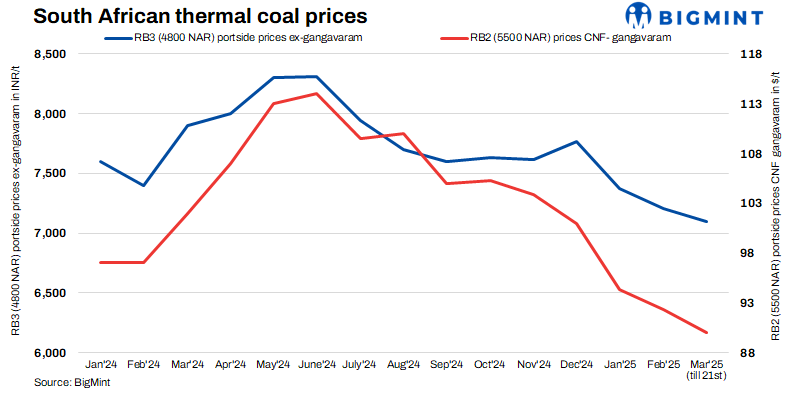 Portside prices of South African thermal coal in India remained stable-to-slightly higher w-o-w at Gangavaram Port. RB2 (5500 NAR) rose by INR 50/t to INR 8,450/t exw, while RB3 (4800 NAR) remained unchanged at INR 7,100/t exw.