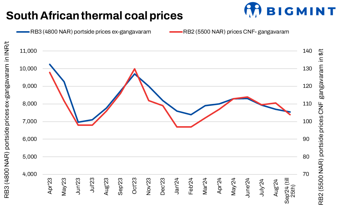 - Portside prices dropped by INR 50/t. RB2 (5500 GAR) and RB3 (4800 GAR) coal prices were recorded at INR 9,400/t and INR 7,550/t ex-Gangavaram, respectively.