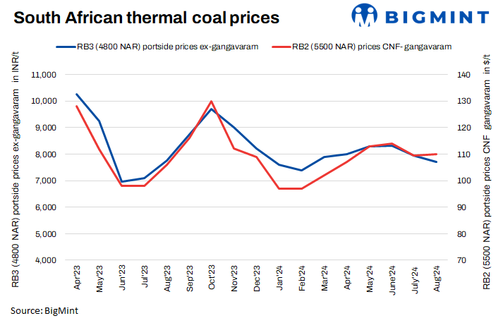 Portside prices of South African thermal coal have remained under pressure. RB2 (5500 GAR) and RB3 (4800 GAR) coal prices were assessed at INR 9,400/t and INR 7,600/t ex-Gangavaram, respectively. Prices of fewer grades decreased by INR 200/t since the beginning of this week. The buying pattern continues to remain subdued on low demand and falling sponge iron offers.