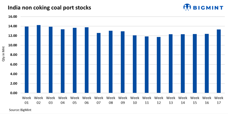 Thermal coal inventories at Indian ports rose 7.4% to 13.29 million tonnes (mnt) in week 17 of CY’25 from 12.37 mnt in the previous week, indicating increased vessel discharge activity at select locations.