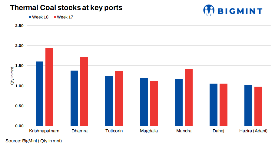 Krishnapatnam port recorded coal stocks declining by 17% w-o-w, with inventories reaching 1.60 mnt in week 18, compared to 1.94 mnt in week 17. Coal stocks at Dhamra port dropped by 19% w-o-w to 1.38 mnt. Thermal coal stocks at key ports like Magdalla (1.19 mnt) and Vizag (0.99 mnt) experienced 6% and 50% increase w-o-w. At Mundra (1.17 mnt), stocks decreased by 18% during the reviewed week.