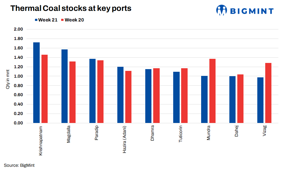 At Jamnagar Port, Tata Chemical’s stocks dropped 6% in week 21 to 0.22 mnt. At Dharma Port, Adani Power’s coal stocks decreased to 0.11 mnt.
