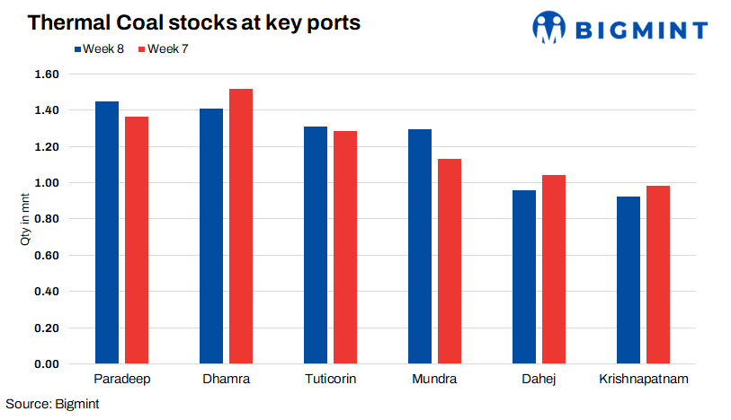 Adani Enterprise witnessed drop in coal stocks of nearly 10% at Dhamra port during week 8 of calendar year 2024 (CY24), reaching 0.37 mnt. Tata/CGPL stocks increased by more than twofold w-o-w, reaching 0.33 mnt at Mundra port.