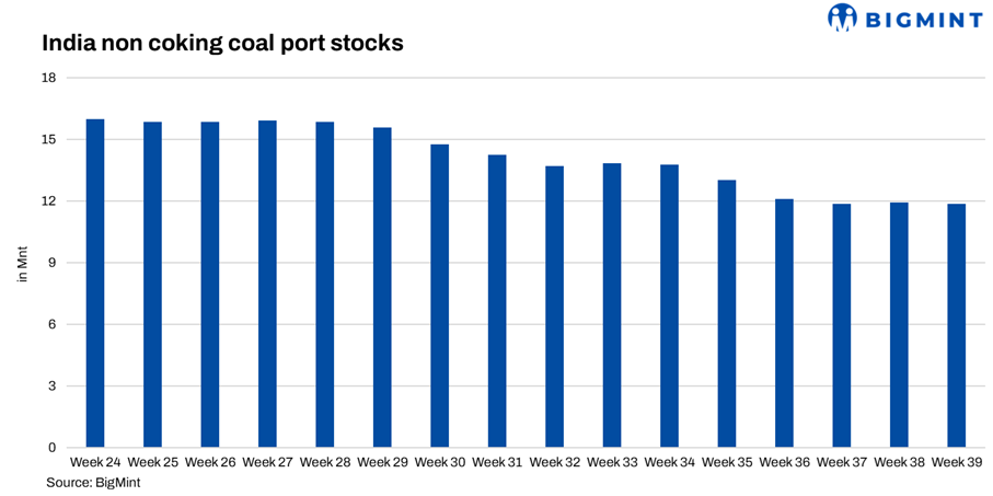 India’s portside thermal coal inventories dipped marginally to 11.86 mnt in week 39 from 11.93 mnt in week 38, as per provisional BigMint data. Market stability was shaped by fluctuating ocean freights and the recent GST reform, with participants preferring a wait-and-watch stance before restocking aggressively.