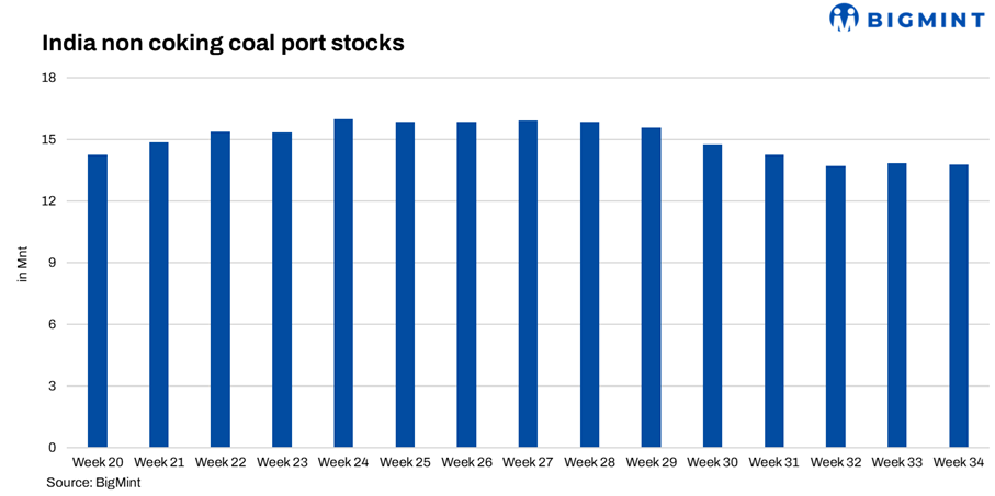 India’s portside thermal coal inventories fell marginally by 0.6% w-o-w to 13.78 mnt in week 34 from 13.86 mnt in week 33, as weaker port arrivals offset gains at select western and eastern ports.