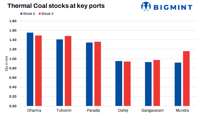 Thermal coal stocks across 21 Indian ports dropped by 4% w-o-w on 06 February, 2024, according to BigMint data. During week 5 of 2024, thermal coal stocks at Indian ports stood at 13.55 million tonnes (mnt) compared to 14.11 mnt in week 4, reflecting a decrease of 4% w-o-w.