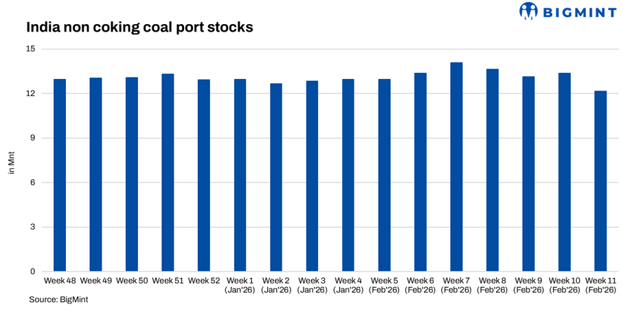 Portside thermal coal inventories across India declined 9.0% w-o-w to 12.15 mnt in the week ended 13 March from 13.35 mnt, marking a sharp correction amid limited fresh cargo arrivals and continued evacuation.