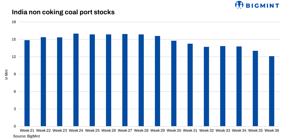 India’s portside thermal coal inventories slipped 7.1% w-o-w to 12.1 mnt in Week 36, down from 13.03 mnt in Week 35. Arrivals stayed muted as elevated import offers and higher freight rates inflated landed costs, while weak domestic demand continued to weigh on fresh bookings from traders and steelmakers.