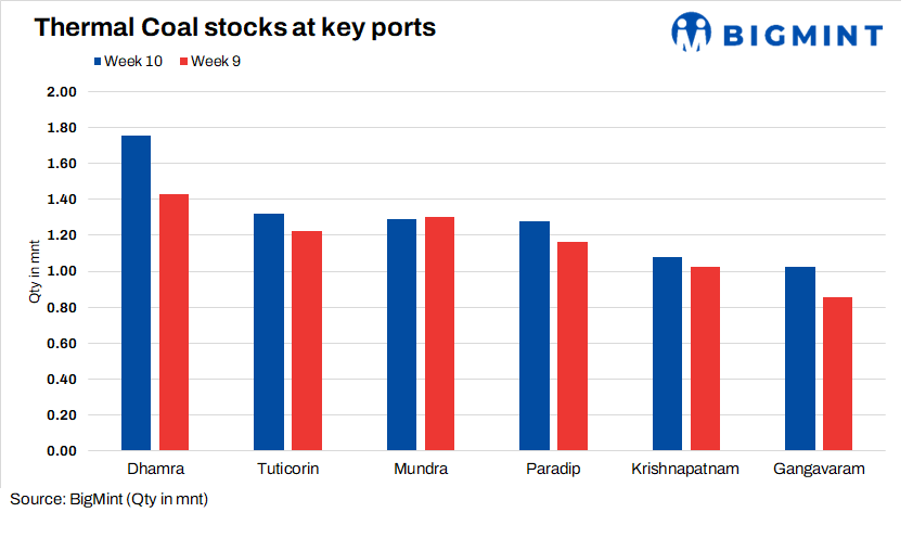 Thermal coal stocks across 21 Indian ports increased by 4% w-o-w on 11 March, 2024, according to BigMint data. During week 10 of 2024, thermal coal stocks at Indian ports stood at 13.71 million tonnes (mnt) compared to 13.22 mnt in week 9, reflecting an increase of 4% w-o-w.