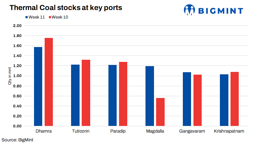 Rashmi Group witnessed drop in coal stocks by 18% at Dhamra port during week 11 of calendar year 2024 (CY24), reaching 0.32 mnt. Adani Power stocks increased by 6% w-o-w, reaching 0.40 mnt at Mundra port.