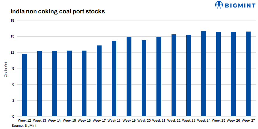 Portside thermal coal inventories in India were largely stable in Week 27 at 15.92 mnt, up slightly from 15.86 mnt in the preceding week, as steady arrivals matched slow demand.