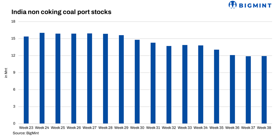 India’s portside thermal coal inventories inched up 0.4% w-o-w to 11.93 mnt in week 38 from 11.88 mnt in week 37, as per provisional BigMint data. Market activity stayed muted, but selective stocking at a few ports offset declines elsewhere.