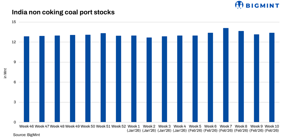 Portside thermal coal inventories across India increased 1.6% w-o-w to 13.35 mnt in the week ended 6 March from 13.14 mnt in the previous week, reversing the decline seen earlier. The increase was mainly supported by stock build-ups at select west coast ports amid steady cargo arrivals.