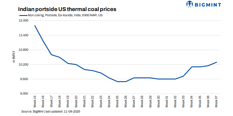 Portside US thermal coal tags in India rose by INR 150/t w-o-w to INR 10,300/t exw, driven by strategic price adjustments by sellers and higher freights. Supply-side and logistics pressures supported the uptrend amid steady demand in the market. Additionally, as per data maintained by BigMint, no thermal coal imports from the US were recorded in India during Aug’25.