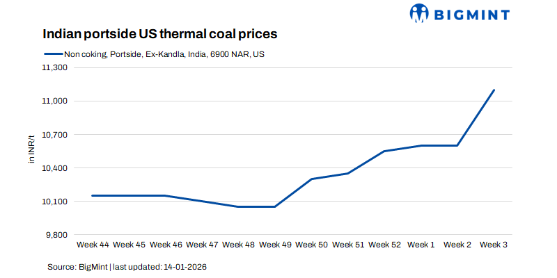 Portside prices of US thermal coal in India increased sharply by INR 500/t w‑o‑w to INR 11,100/t. The rise was driven by a domestic material shortage and decent demand from cement manufacturers, likely as pet coke remained costlier. Additionally, geopolitical tensions, related to potentially higher tariffs from the US, are expected to further disrupt availability.
