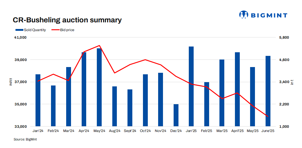 A major north India-based four-wheeler manufacturer auctioned 4,800-5,000 t of CR busheling scrap (low manganese) at its facility in Gurgaon, Haryana, on 10 Jun’25. The winning bids ranged between INR 33,900-34,000/t exw, reflecting a decline of INR 950-1,000/t compared to the previous auction on 13 May’25. The reduction in prices suggests market pressures such as subdued demand.