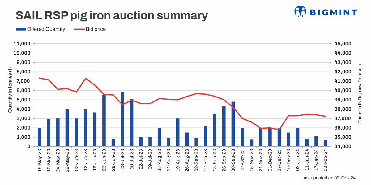 SAIL’s Rourkela Steel Plant auctioned 1,100 t of steel-grade pig iron on 03 Feb’24. 700 t material was booked at an average price of INR 37,240/t exw. Bid prices decreased compared to the previous auction on 17 Jan’24, where entire material of similar-grade material was booked at an average price of INR 37,400/t exw.