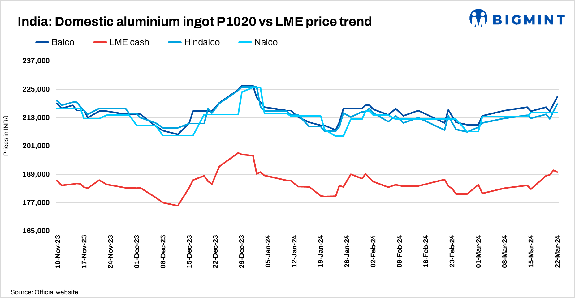 India: Primary aluminium producers raises ingot prices by INR 3,000/t ($36/t)