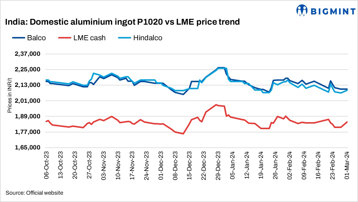 India’s primary aluminium producers have revised ingot (P1020, 99.7%) prices by INR 2,000/t ($24/t). Post-revision, Hindalco’s prices stood at INR 209,000/t ($2,521/t). Meanwhile, Balco’s prices stood at INR 210,000/t ($2,533/t). All prices are ex-works and exclude GST.