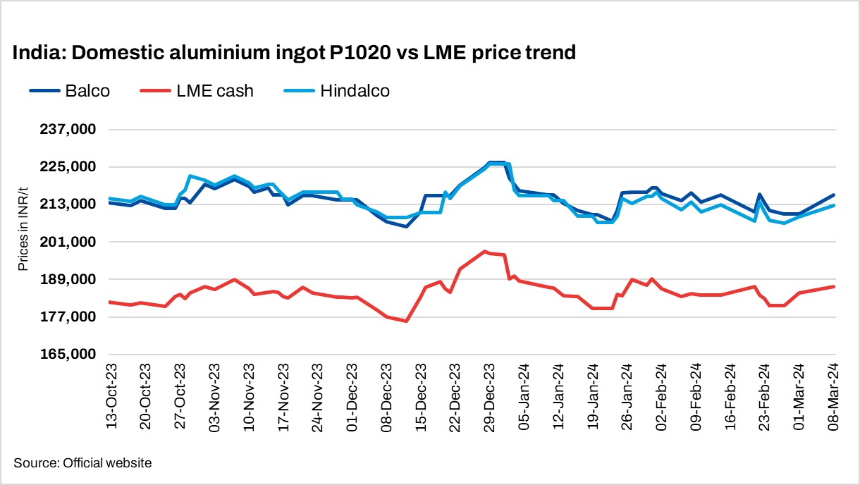 India’s primary aluminium producers have revised ingot (P1020, 99.7%) prices by INR 2,250/t ($27/t). Post-revision, Hindalco’s prices stood at INR 212,750/t ($2,572/t). Meanwhile, Balco’s prices stood at INR 216,000/t ($2,611/t). All prices are ex-works and exclude GST.