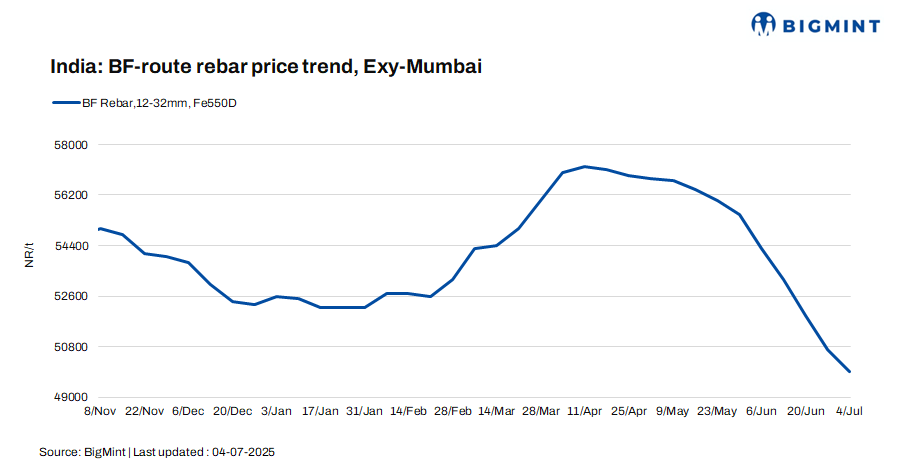 Trade-level BF rebar prices declined by INR 800/t ($9/t) w-o-w to INR 49,900/t ($584/t) exy-Mumbai, as per BigMint’s assessment on 4 July. Prices are exclusive of GST at 18%.