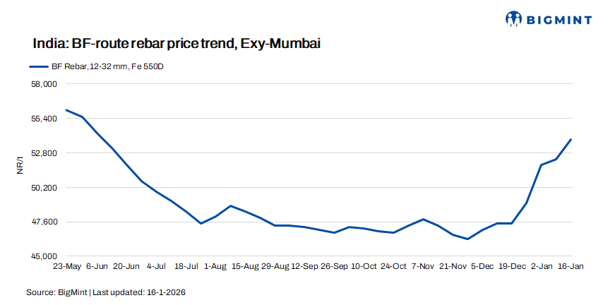 Trade-level BF-rebar (distributor to dealer) prices rose w-o-w by INR 1,300/t ($14/t) to INR 53,800/t ($592/t) exy-Mumbai as per BigMint’s assessment on 16 January 2026. Prices are excluding GST at 18%.