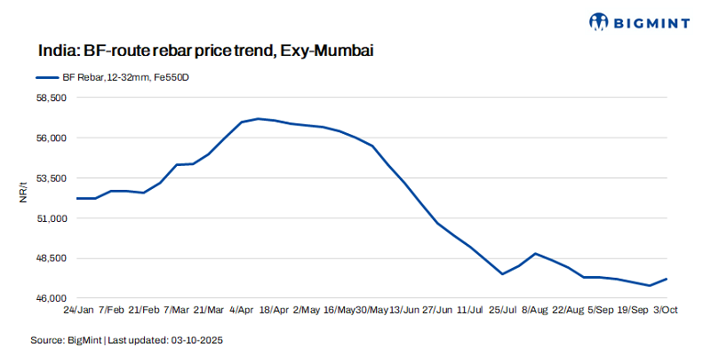 3. IF rebar prices drop m-o-m in Sep’25: Trade-level IF-rebar prices in India showed a broadly weak to mixed trend in September 2025. At the beginning of the month, demand improvements led to minor price gains, but overall market activity remained subdued due to the festive season and monsoon-related disruptions, particularly in the central and eastern regions. Inventory levels remained moderately high at 12-15 days, prompting manufacturers to offer discounts to clear stock. Market sentiment was cautious, driven by limited buying interest and the need to manage excess inventory. Rebar prices dropped by INR 300/t ($3/t) m-o-m to a monthly average of INR 44,100/t ($497/t) exw-Mumbai in September 2025.