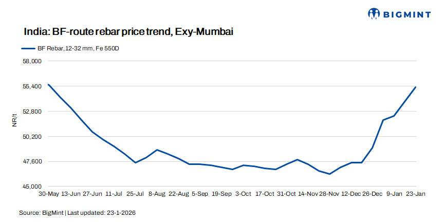 Trade-level BF-rebar (distributor to dealer) prices rose by INR 1,500/t ($16/t) w-o-w to INR 55,300/t ($601/t) exy-Mumbai as per BigMint’s assessment on 23 January 2026. Prices are excluding GST at 18%.
