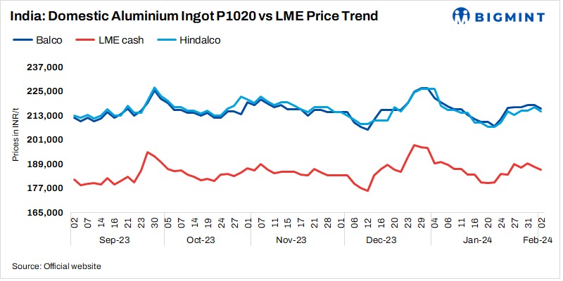 India’s primary aluminium producers has decreased ingot (P1020, 99.7%) prices by up to INR 2,000/t ($24/t). Post-revision, Balco’s prices stood at INR 216,500/t ($2,614/t). Meanwhile, Hindalco’s prices were at INR 215,000/t ($2,595/t). All prices are ex-works and exclude GST.
